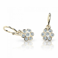 Gyermek fülbevaló sárga 14 karátos aranyból, aranyos virágmintával, átlátszó cirkóniákkal díszítve.