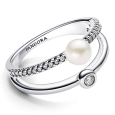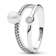 Ezüst PANDORA dupla gyűrű módosított édesvízi fehér gyönggyel és átlátszó cirkóniákkal.