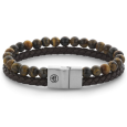Férfi karkötő REBEL & ROSE, amely egy sötétbarna bőr karkötőt és természetes kőből - tigrisszemből - készült gyöngyöket kombinál.