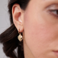 Dámske oceľové náušnice BROSWAY Chakra v zlatom tóne s visiacim príveskom v tvare srdca. Prívesok má plastický tvar so zvýrazneným horným reliéfom a jemnými guľôčkovými detailmi po obvode, čo vytvára dekoratívny a výrazný efekt. Náušnice sú zavesené na tenkých kruhových náušniciach, ktoré dopĺňajú ich elegantný vzhľad.