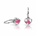 Detské náušnice z bieleho 14 karátového zlata, v roztomilom dizajne srdiečok, zdobené tmavo ružovým zirkónom.