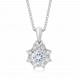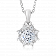 Dámsky strieborný prívesok zdobený zirkónmi čírej farby, ktoré sú usporiadané do tvaru kvetu.