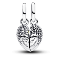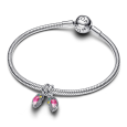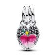 This sterling silver PANDORA dangle bead features a magnetic split design with a pair of birds forming a heart. The details are highlighted by vibrant orchid, pink, clear and yellow glazes, royal green crystals and engravings of "We Stick Together" and "Birds of a Feather".