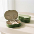 The elegant oval-shaped jewelry box is covered with soft velvet material in a gray shade and closes with a metal zipper.