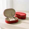The elegant oval-shaped jewelry box is covered with soft velvet material in a red shade and closes with a metal zipper.