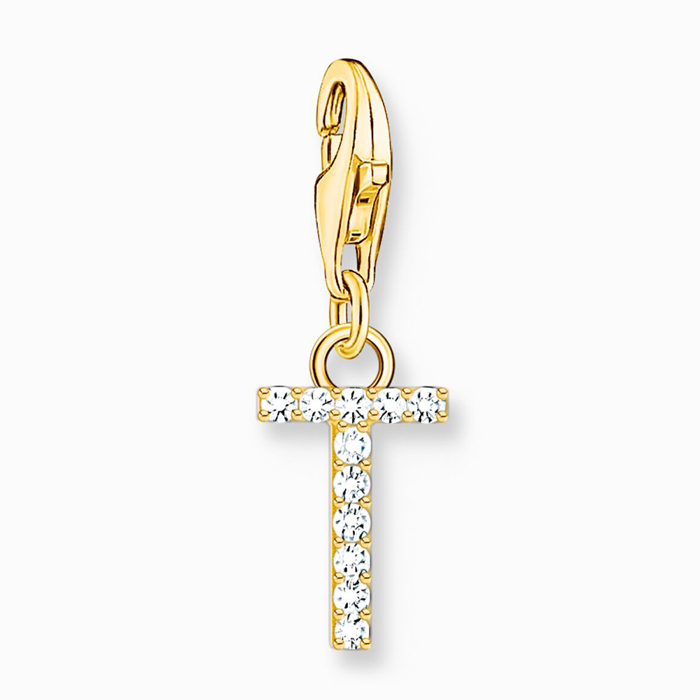 Silver charm pendant "Letter T gold" with clear zircons, gold-plated with 18 ct yellow gold.