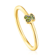 The ring is made of gold-plated silver and decorated with the iconic TOUS teddy bear set with green chrome diopside stones. The combination of gold tone and vibrant green creates a fresh, modern contrast with the brand's typical playfulness.